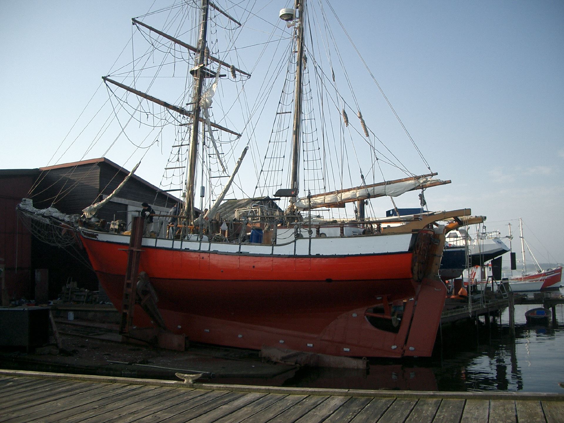 Slipanlage auf durchgehenden ca. 15 m langen Wagen für Schiffe bis 100 t und einem Tiefgang bis 3,00 m. Seitlich abgestützt durch zwei Rungen, die mit Gewindespindeln stufenlos einstellbar sind.